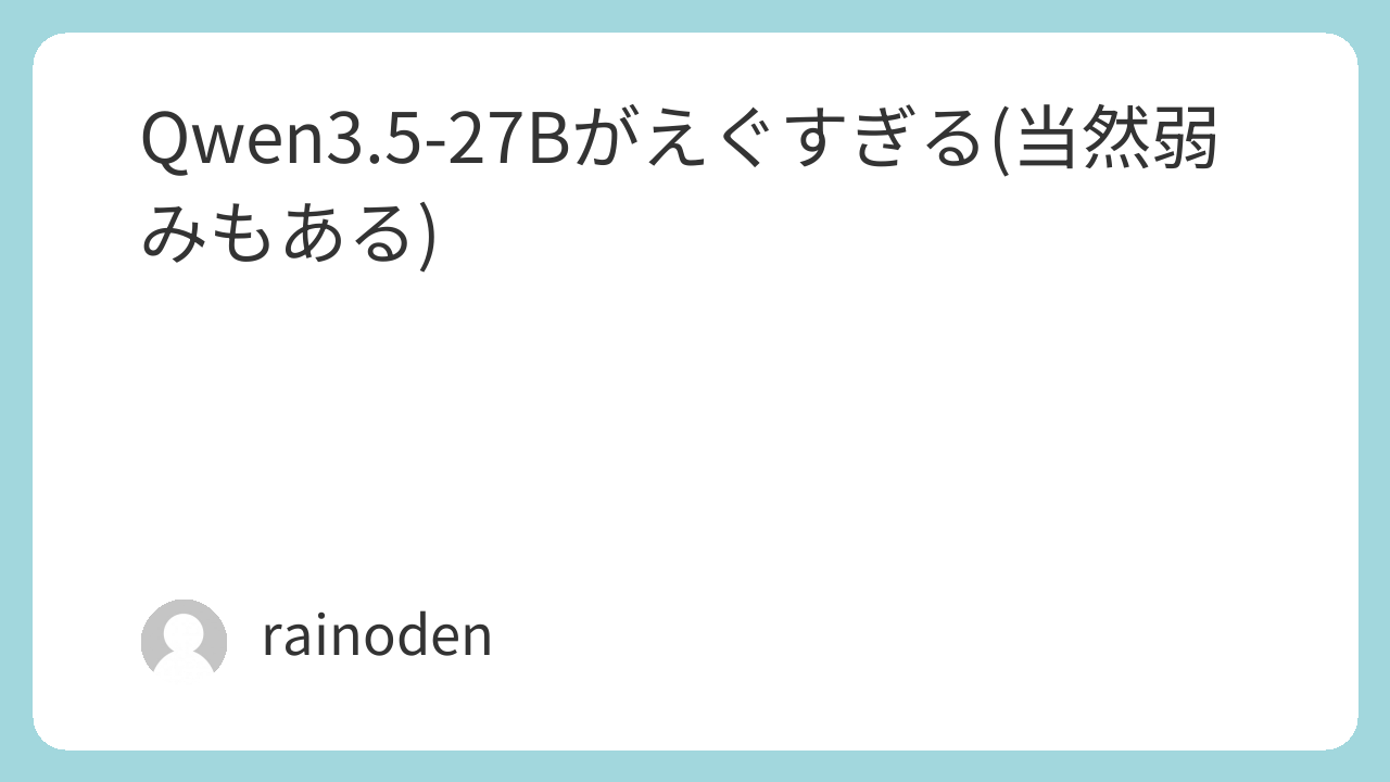 以前Qwen3.5-27Bを紹介する記事で、「まとも」とか「簡単なバイブコーディングができる」とか「少なくともClaude 3.7 Sonnet以上の働きをしてくれます」といった感想を書きました。正直これは著しい過小評価でした。